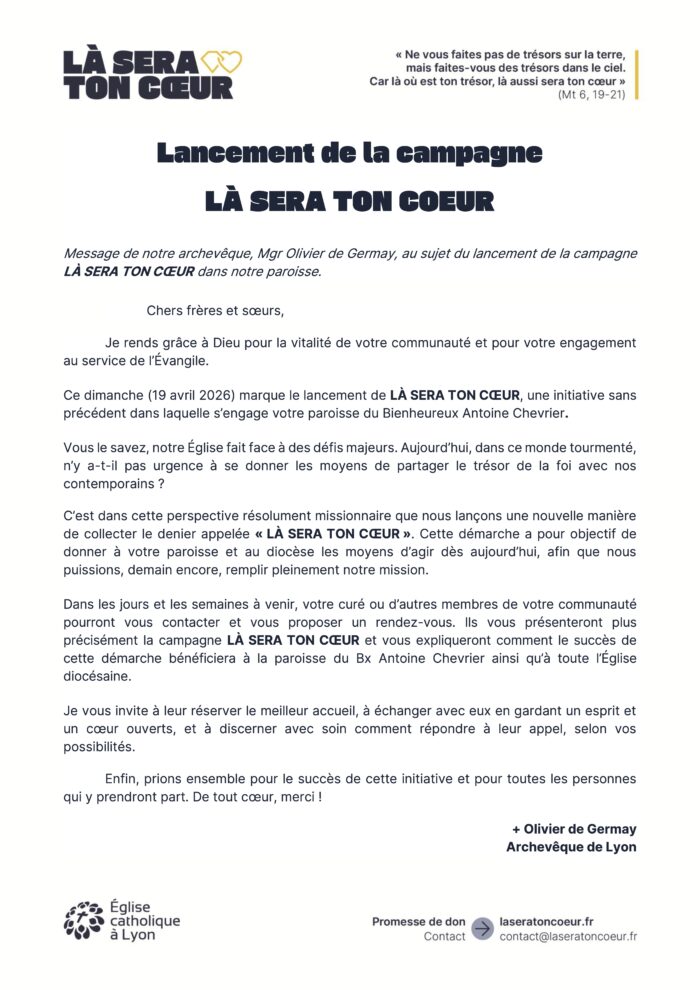 Vous pouvez remettre vos dons en espèces ou par chèque (libellés à l’ordre de l’Association Diocésaine de Lyon) ou donner en ligne sur www.donnons-lyon.catholique.fr/